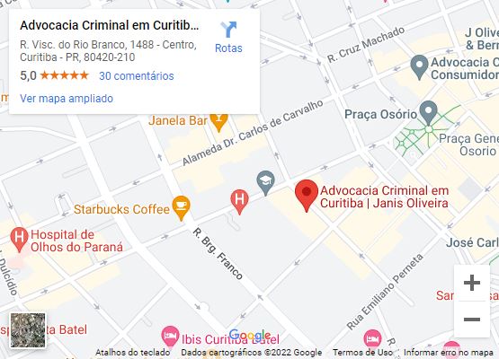 O escritório Janis Oliveira Advocacia Criminal Especializada está localizado fisicamente no Centro de Curitiba/PR e atua com ética e seriedade na prestação de serviços jurídicos preventivo, consultivo e contencioso na área criminal, em suas diversas ramificações.